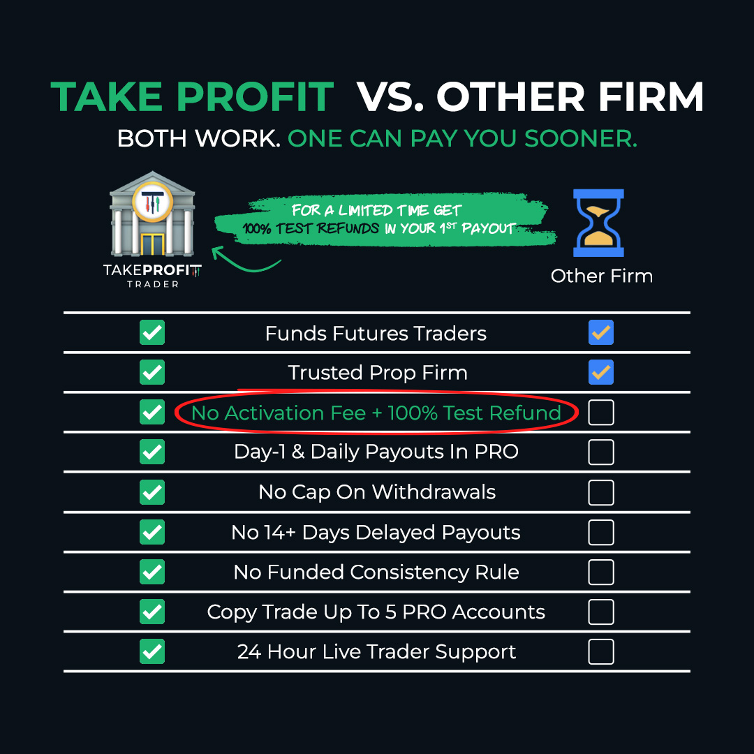 As an industry first, Take Profit Trader uniquely offers convenient PRO resets so you don’t have to go back through the test if you don’t want to. You get to choose.